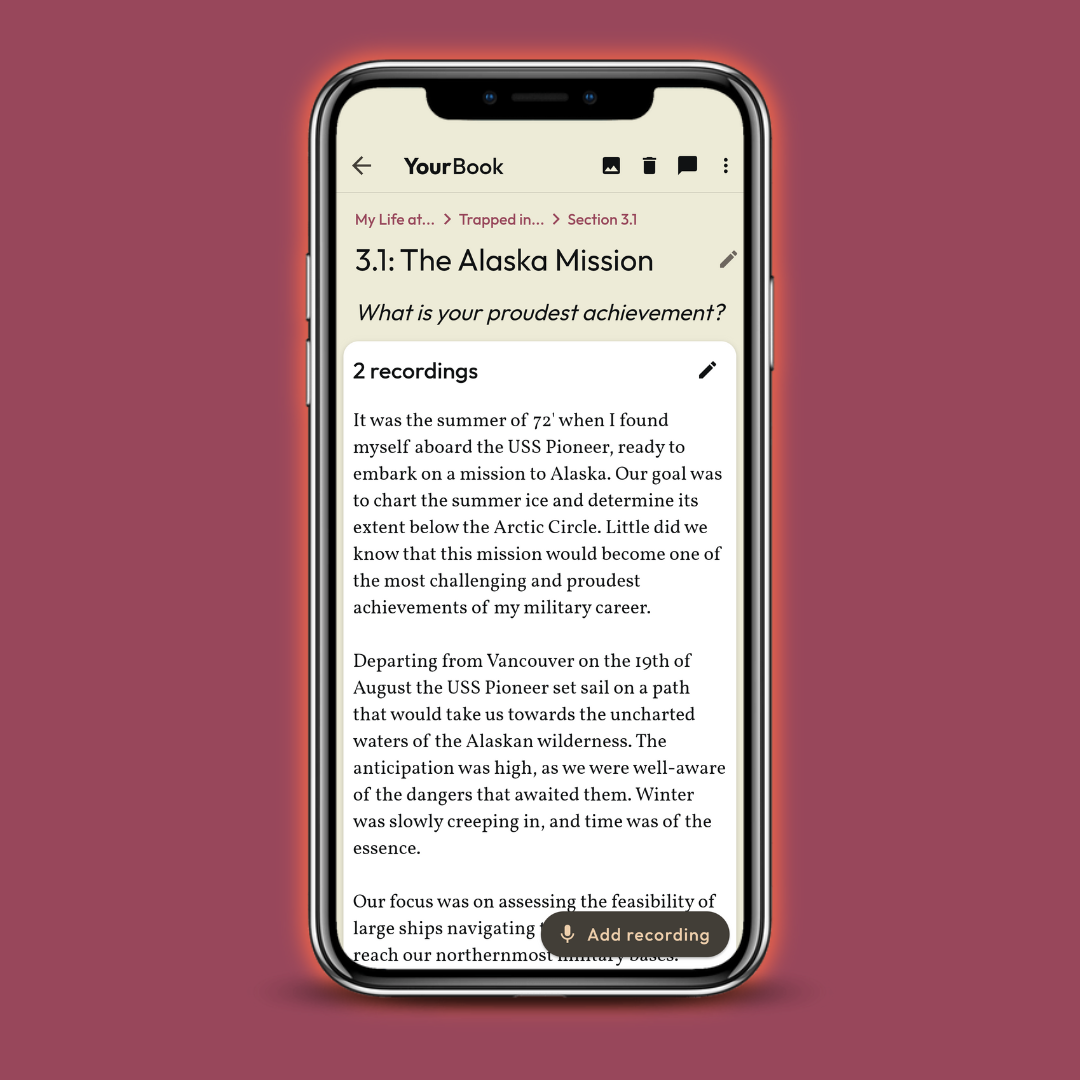 YourBook is a memoir writing service that allows you to share your life story effortlessly. You answer a series of questions verbally, and our AI transforms your responses into a beautifully crafted narrative. Your memoir is then professionally typeset, printed, and delivered to you.